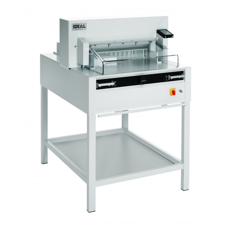 Commande bi-manuelle EASY-CUT avec déclenchement séparé pour la descente de la lame et de la presse. Écran de commande tactile pour le réglage de la butée arrière. Dispositif de pression automatique. Lame de qualité supérieure en acier d'Allemagne. Entraînement électro-mécanique de la lame. Porte lame tout en acier avec glissières réglables. Porte outils pratique sur la table arrière.